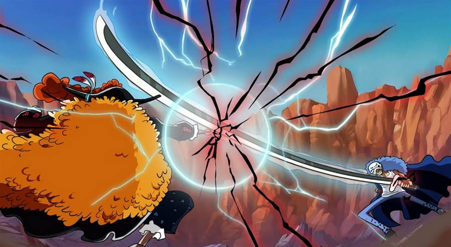 羅雖然是手術果實能力者,但也是一位用劍高手,他持有名刀鬼枯,正好可以和拿著初代鬼徹的金星碰一碰。不僅如此,羅的room可以在一定范圍內瞬移,而金星在馬骨形態下也擁有高速移動的能力,想必這二人的對決想必也是相當激烈的。