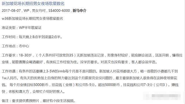 还有的招聘广告上明确写着:有条件的话要赚上3-5W的rmb每个月是不是问题的。新加坡人对花场都很大方,唱一首歌的小费都几千到1w人民币。